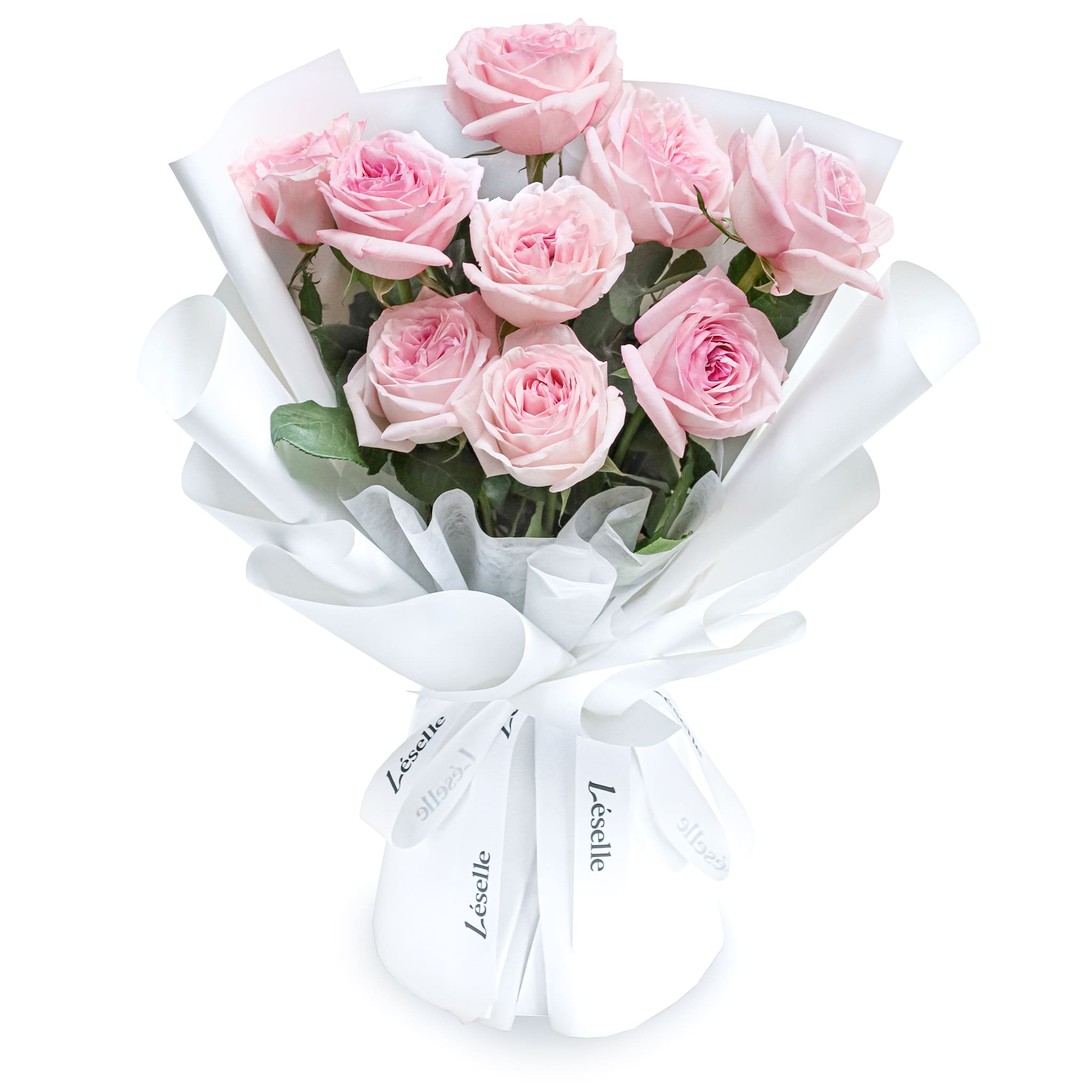 Featuring sweet pink roses from America complemented with eucalyptus leaves. Wrapped in white matte wrapping paper and white polka dot mesh this classic round-shaped bouquet is designed in a spiral arrangement to create an elegant pink rose bouquet.