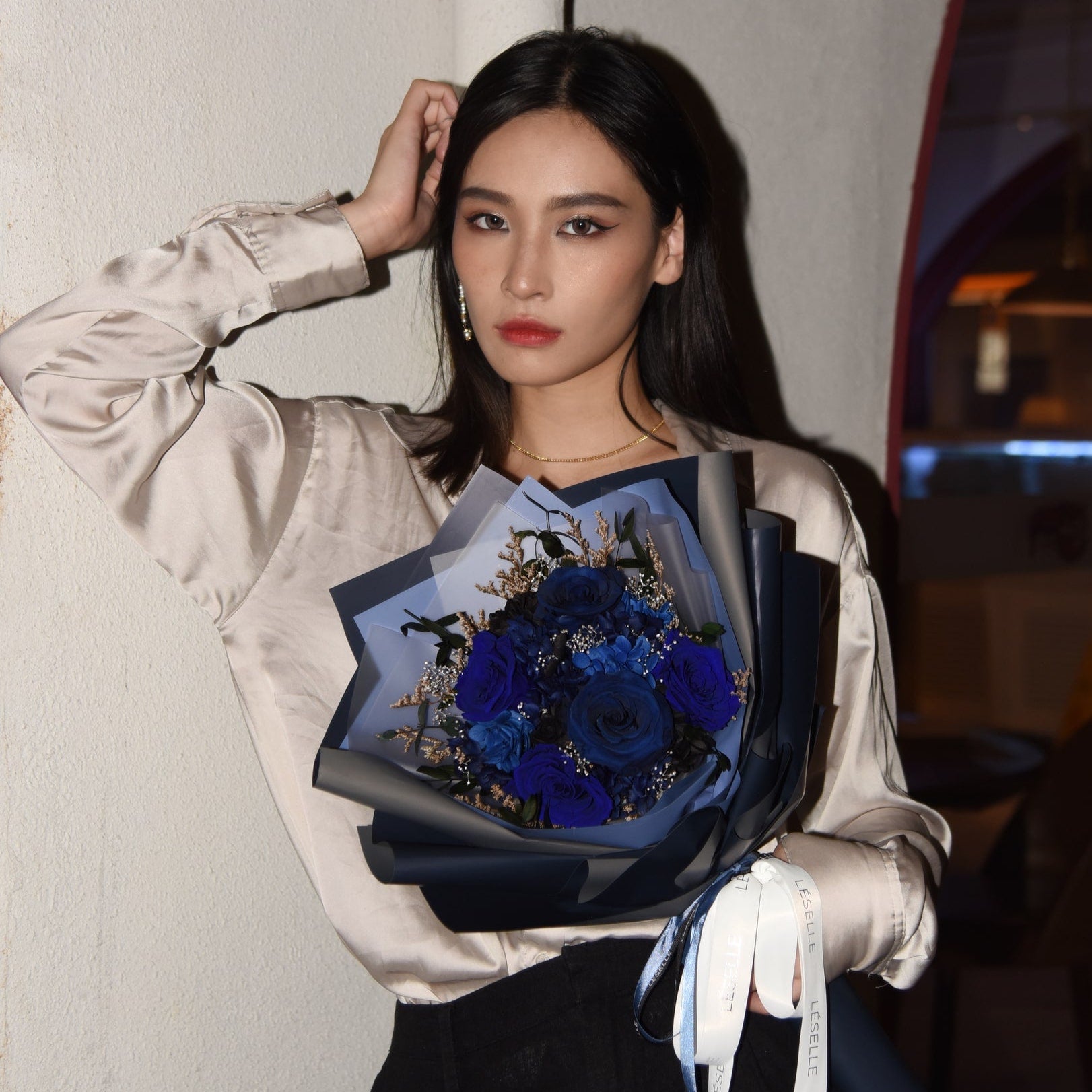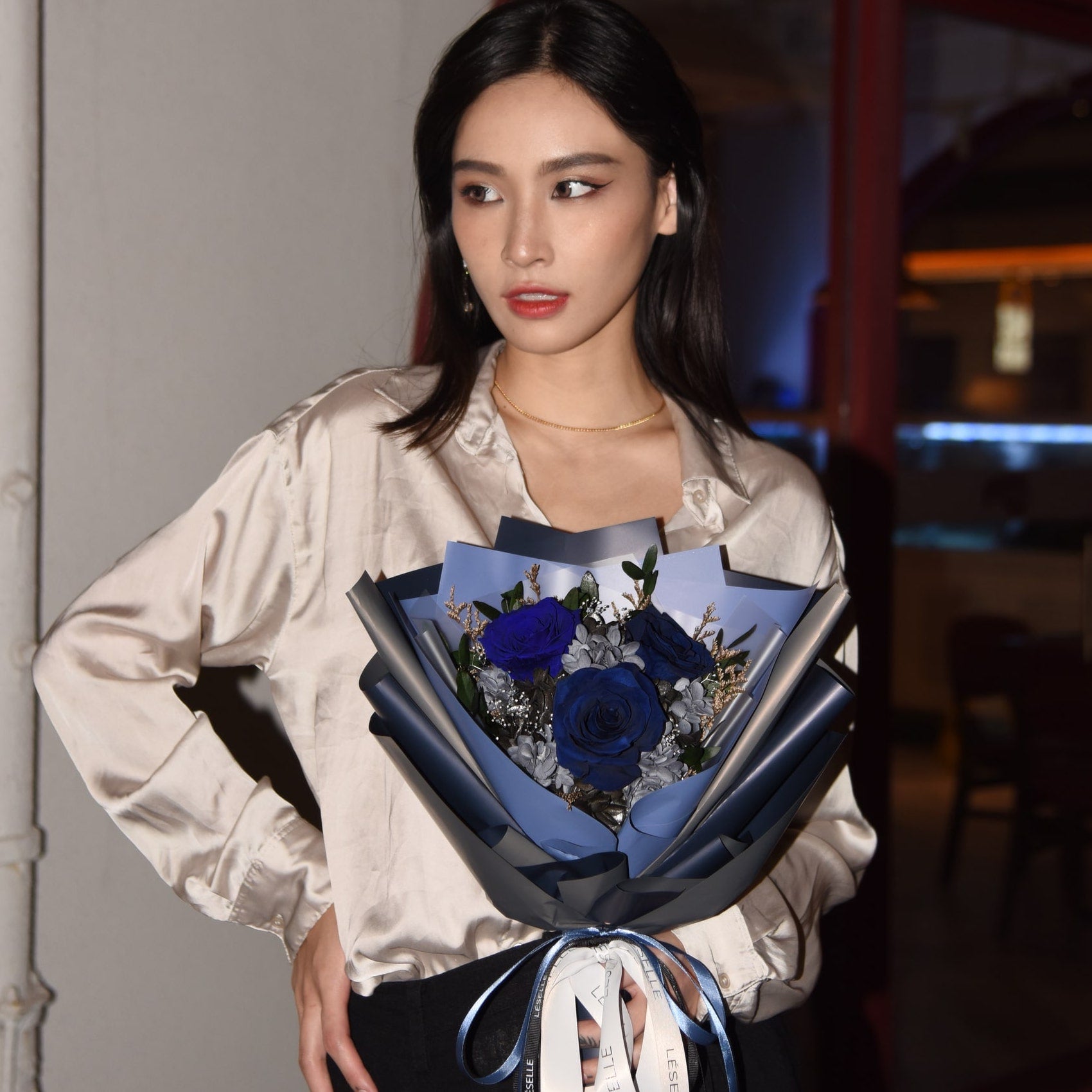 With the dark blue and grey wrapper, the floral arrangement has been further uplifted by added sophistication.