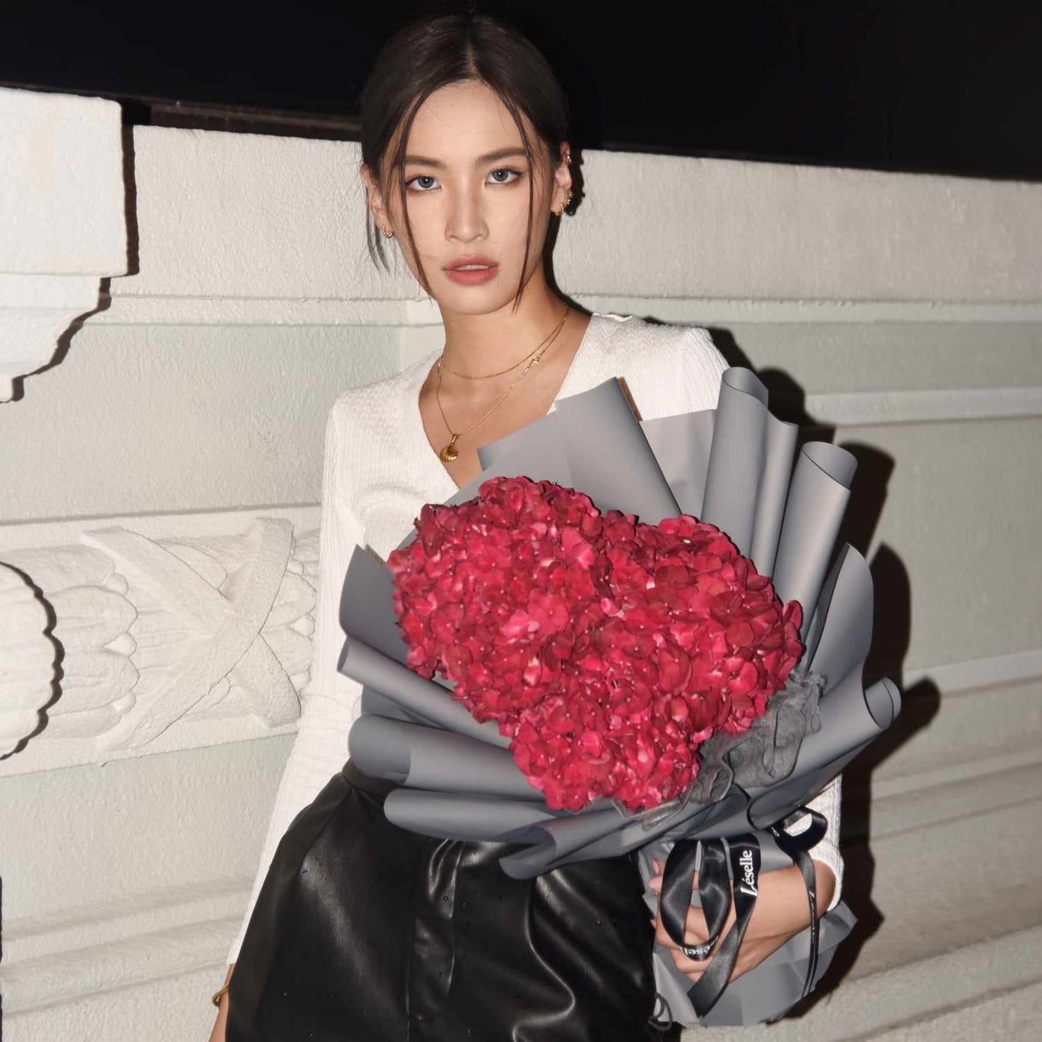 Featuring Pink Hydrangea from Ecuador complemented with eucalyptus leaves. Wrapped in white matte wrapping paper and white polka dot mesh this classic round-shaped bouquet is designed in a spiral arrangement to create an elegant pink rose bouquet.